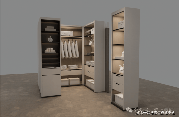 主卧和约99平户型一样,衣柜更大形成衣帽空间,还交付有半开放式、类似于酒店的迷你吧设计:
