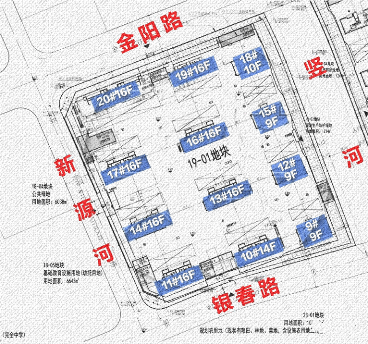 19-01地块规划:拟建7栋16F高层住宅、3栋9F高层住宅、1栋14F高层住宅、1栋10F高层住宅以及若干配套用房,规划住宅套数下限622套。