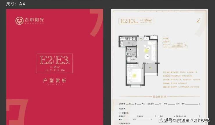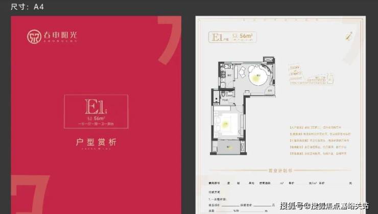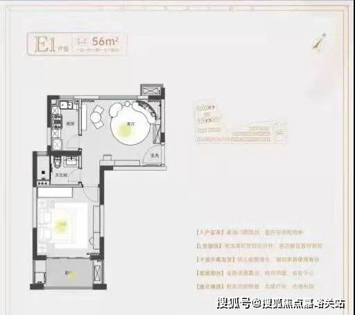 建面约55㎡1房1卫户型,低总价优质上车小户型,做到了双开间朝南+卫生间干湿分离+卧室带飘窗+客餐厅相连,小而美的一个户型。