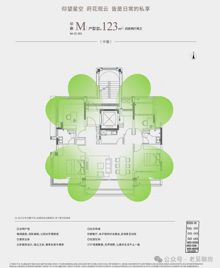 产品是一个新盘立足的根本,这次华发推出的建面约123㎡四房,属实是把改善户型的格局打开了——这个面积段四房不稀奇,但能把独立前厅、全景阳台、花池、四叶草户型这些“豪宅标配”全都塞进去,放眼整个市场都太狠了。