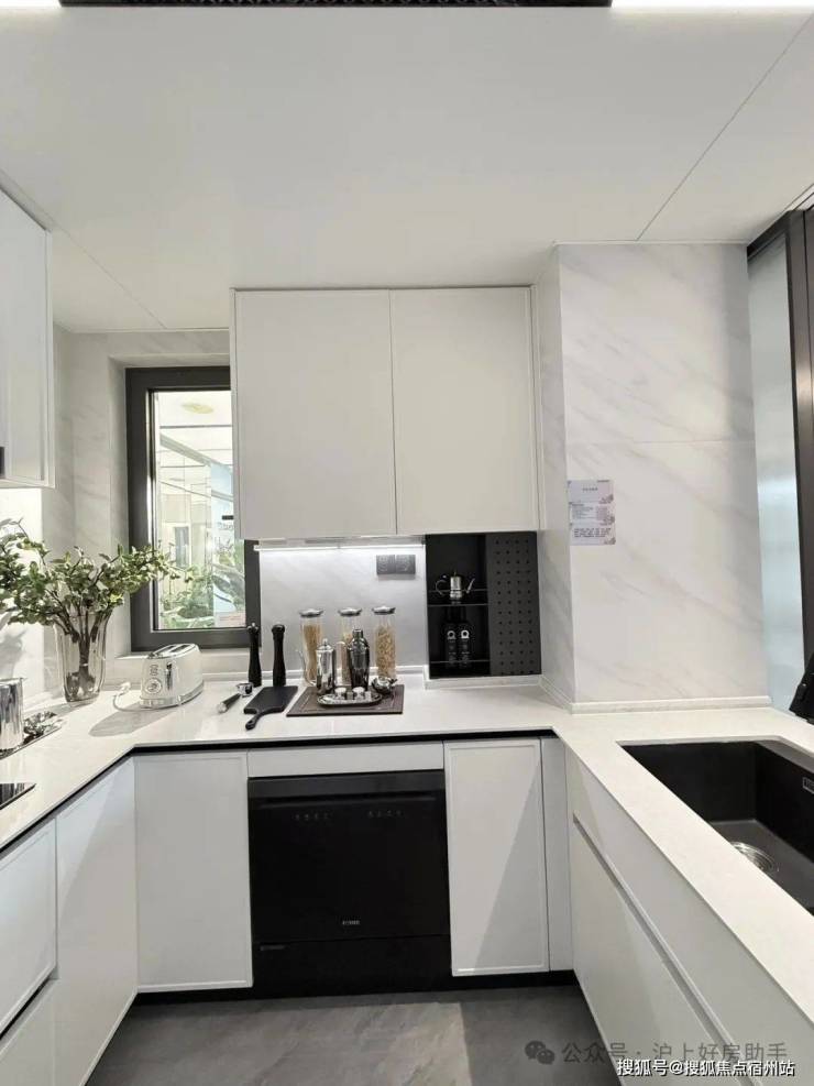 厨房U型操作台面,并配备了洗碗机、末端净水,甚至凉霸,不仅能解放双手,还解决了炎炎夏日厨房做饭闷热的烦恼;