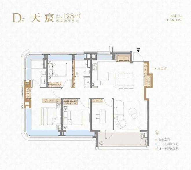 项目建面约128㎡4房户型延续了前作3S墙的设计,保证了收纳空间的丰富性。
