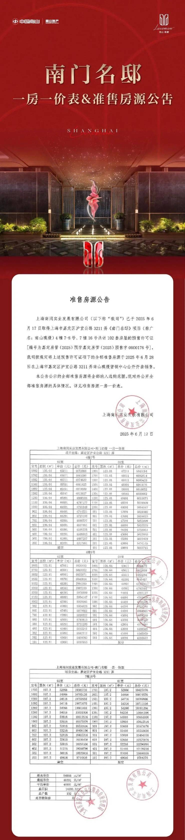 嘉定新城「🔵南山璞缦售楼处电话☎:400-8787-740【售楼处已认证】⚡⚡」加推建面约106-198㎡三房四房,共计102套!内附一房一价表!