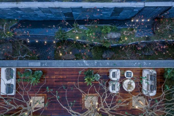 自【悬浮茶室】拾级而上,在【思韵书院】外,一处闲憩放空的【阅川水岸】至此呈现,脚下溪流自脚下蜿蜒而过;眼前,是幻影蓝奢石池底的幽邃微光。一株来自地中海的油橄榄,与一棵百年老桩紫薇在此相望。