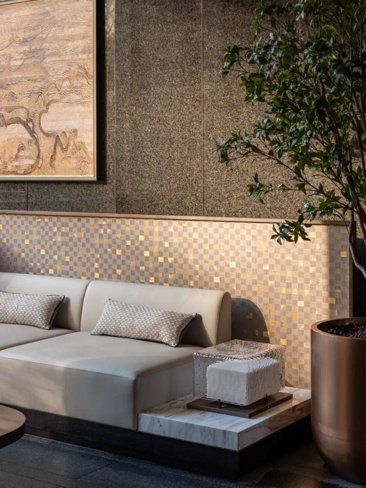 黄金丝绸大理石流转着真丝般的光泽,白玉与卡里冰玉小台映照天光云影。