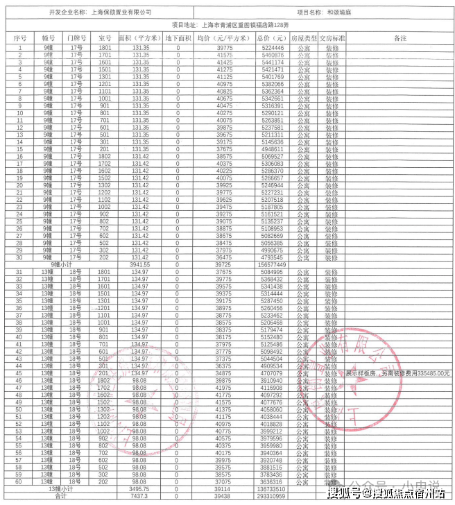 一房一价表发布: