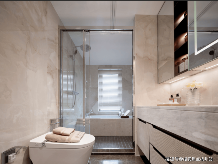 厨房采用嘉格纳油烟机与燃气灶,博世冰箱,骊住水槽。卫生间采用汉斯格雅五金,杜拉维特卫浴套装、恩仕智能马桶。