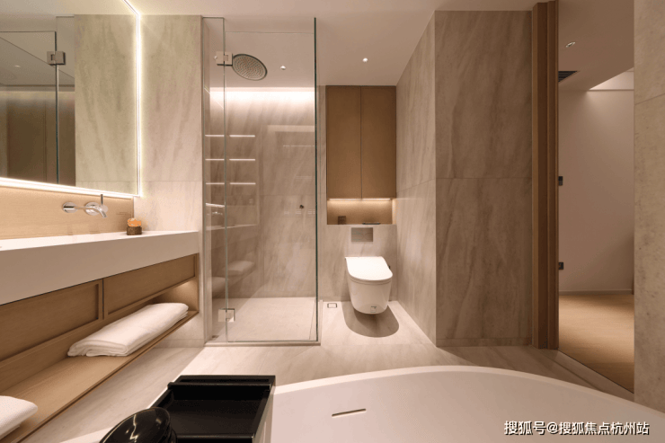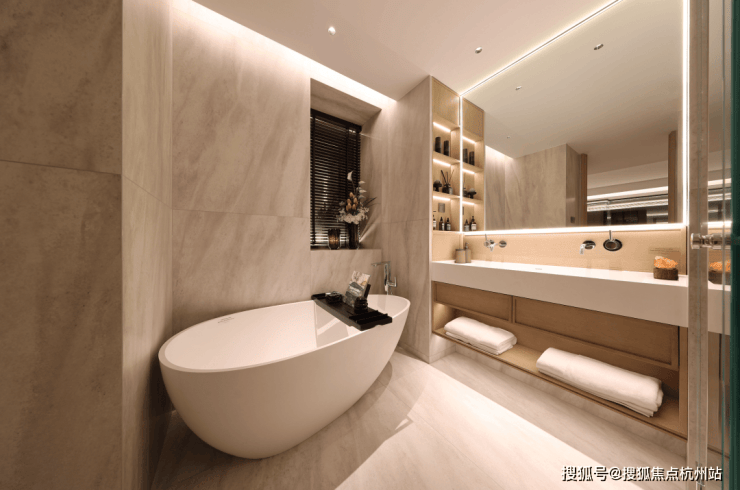 主次卫内的水龙头,也都配置了德国当代 的墙出式水龙头,墙出式水龙头的采购成本要高于同等品牌的台面龙头。与龙头搭配的,是设计师定制的极简风的双台盆一体化洗漱台和独立式浴缸。