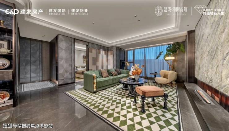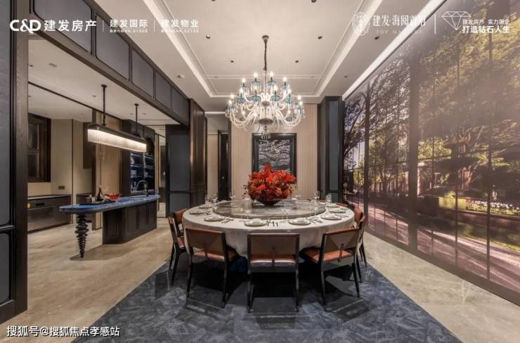 建发海阅首府售楼处电话:400-8080-420☎地面拼花沿用了海派风格的黑白拼接精髓!用料也极为考究!玄关柜的中间镶嵌了蓝翡翠岩板,提升了整体进门的质感,柜体的面层采用了咖色纹理皮革设计!单是这个玄关,就尽显项目品质和品味!超大空间客餐厅!极为正气阔达!