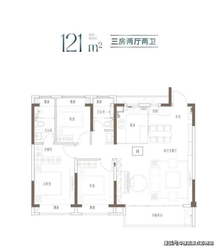 建面约91m²的这个户型,3开间朝南,全屋阳光充足;L型厨房转角移门设计,最大化空间视野;四飘窗设计,通透空间享受;动静分区,亲密有度;套房式主卧,容纳私谧生活点滴。