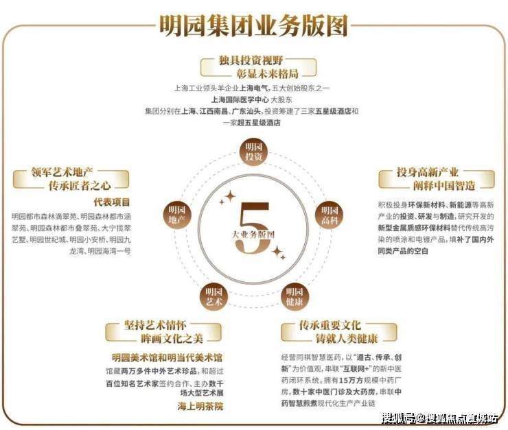 明园地产、明园投资、明园艺术、明园健康、明园高科五大业务版图