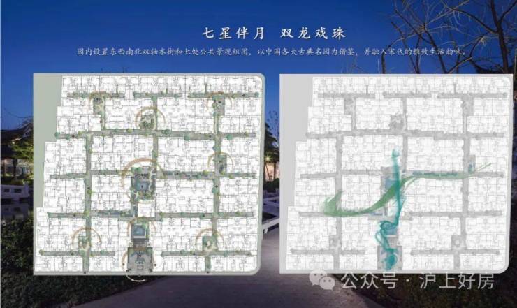 上海桃花源容积率仅0.4,园内布局南北主轴、东西水巷,宅间巷道串联融通,设九大景观组团,师承中国现有的古典名园,形成“一环、两轴、九境”布局。而三期188席中式园宅,建筑依巷分布南北,横平竖直,秩序井然。