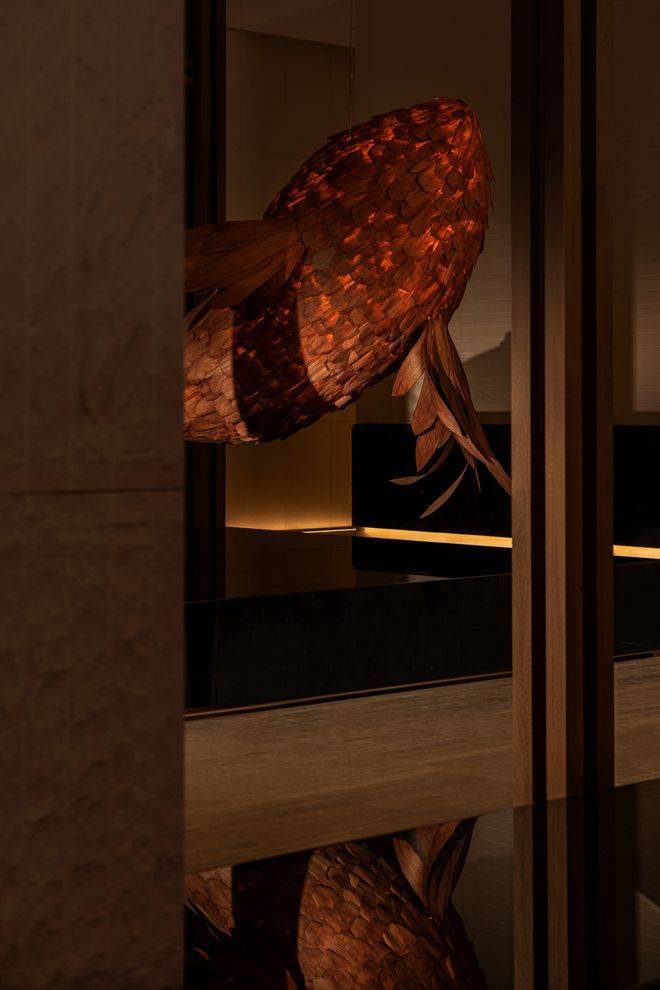 最惊艳的是地下一层的雪茄威士忌廊:赭石色调的墙面搭配深棕皮革沙发,复古中透着奢华;吧台后的奢石背景墙,在灯光下泛着云影般的光泽,与旁边禅意茶室的日本桧木形成 “冷暖碰撞”。