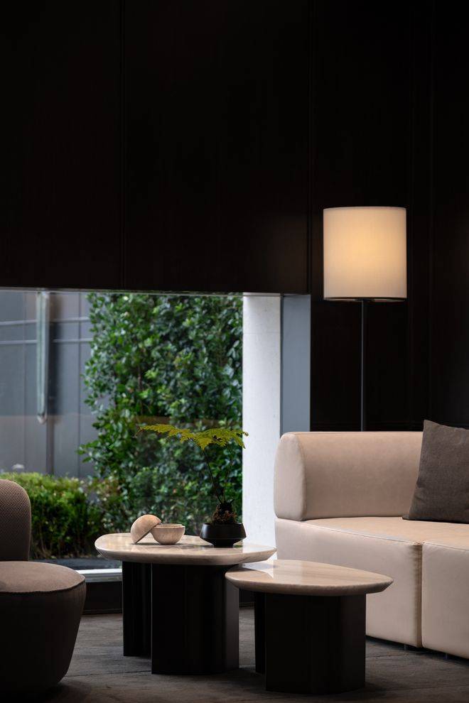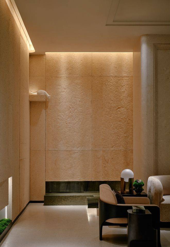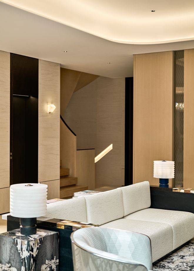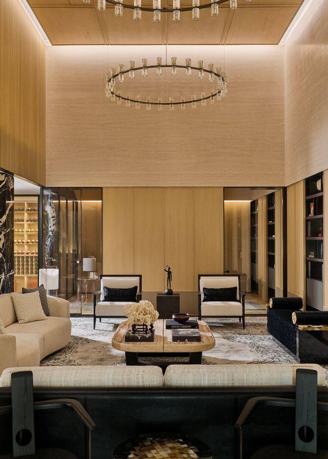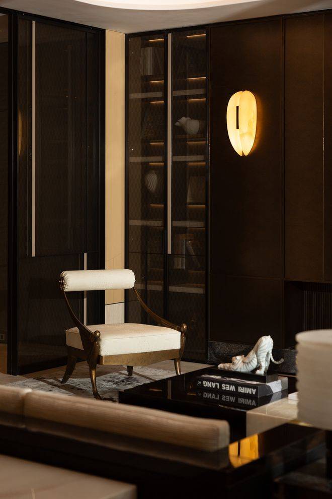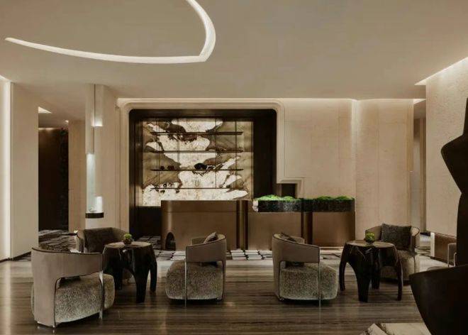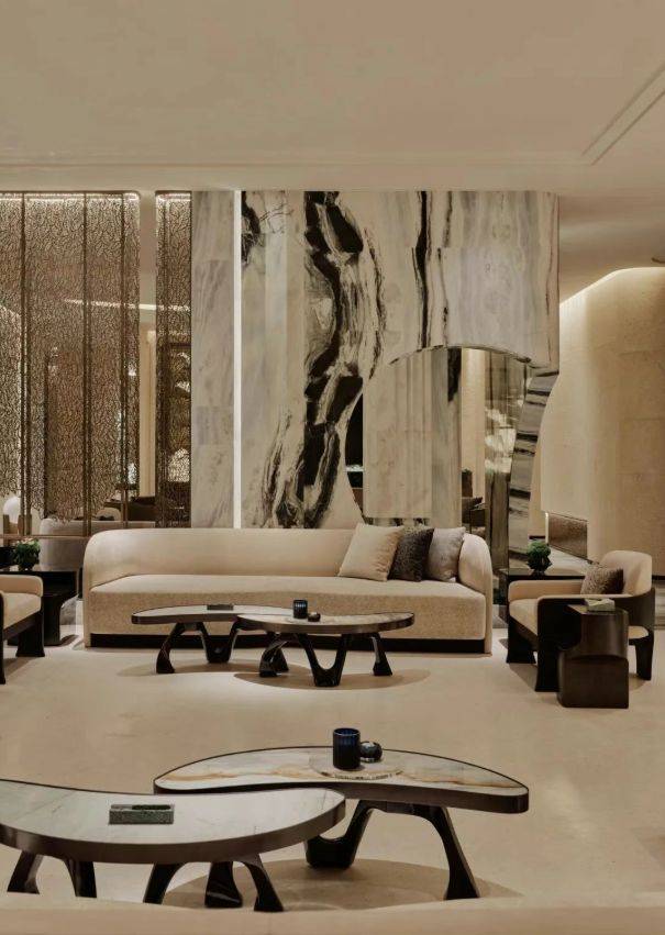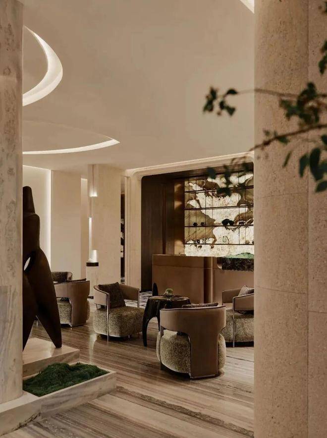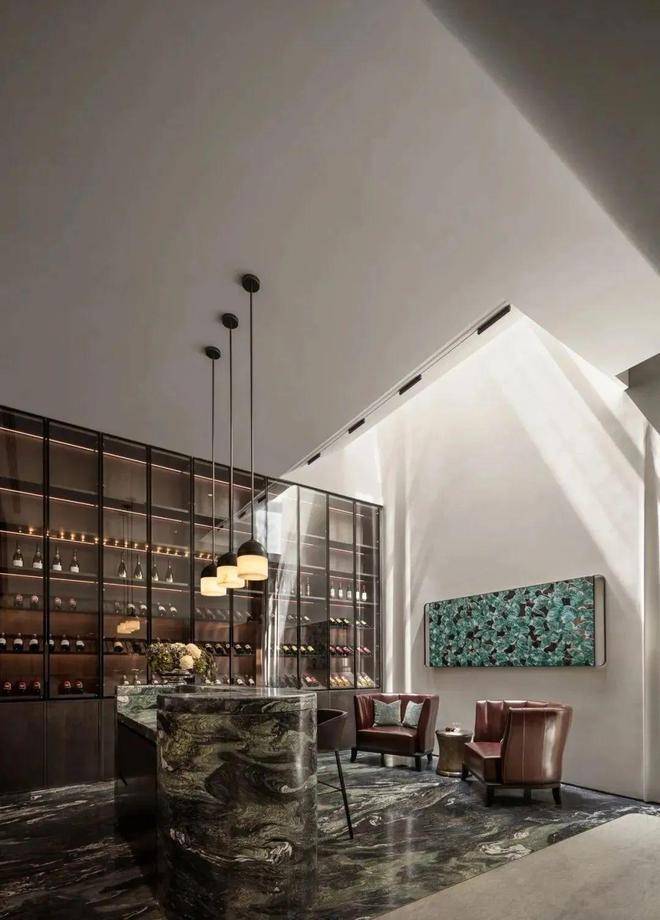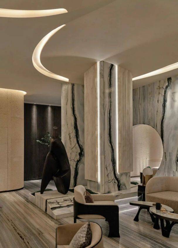 地下一层的沙龙区更是李玮珉 “材料叙事” 的典范:黑底米白纹样的大理石背板如同一幅水墨画卷,圆圈吊灯柔和了挑高空间的空旷感,内置书架与艺术雕塑的点缀,让 “私人外交” 的氛围悄然生长。