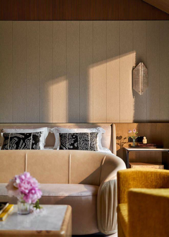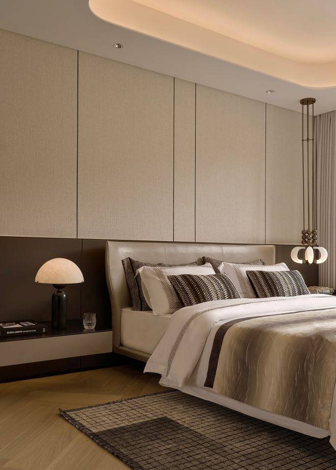 集艾设计的软装则为空间注入了 “摩登海派” 的灵魂。在 305 样板间的主卧里,浅米色壁布与橡木家具奠定了温润的基调,明黄色的单人椅是空间的 “点睛之笔”,既打破了中性色的沉闷,又不显得张扬。