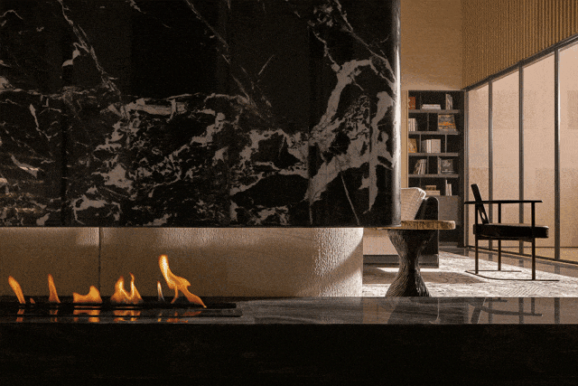 地台壁炉里跳动的火光,与西厨吧台的暖光呼应,形成 “明暗相间” 的社交场域。