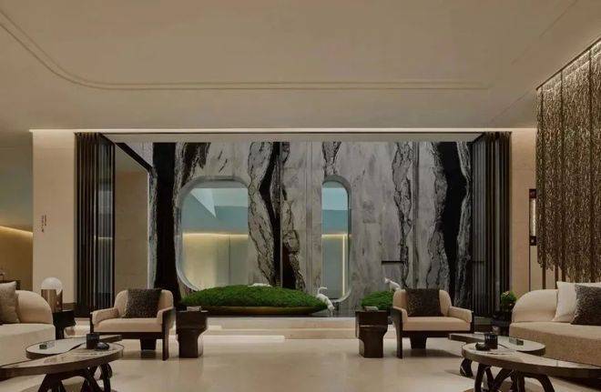 会所 “谿山” 是其东方美学的集中体现:入口处一方熊猫白石材体块,纹路如江水般流淌,中空的圆拱造型像游园时偶遇的山洞,引导着访客进入 “隐世之境”。