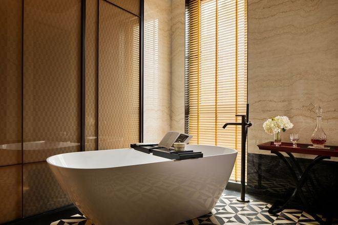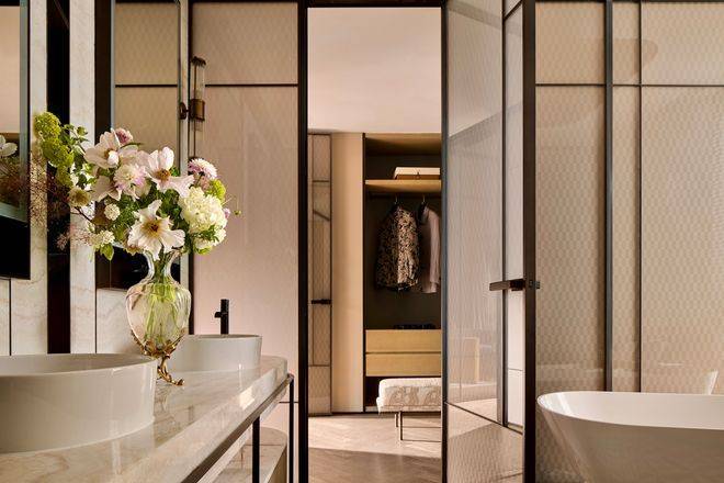 衣帽间的玻璃隔断上,隐约可见抽象的云纹图案,源自老上海月份牌的灵感,被转化成了当代的设计语言。