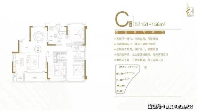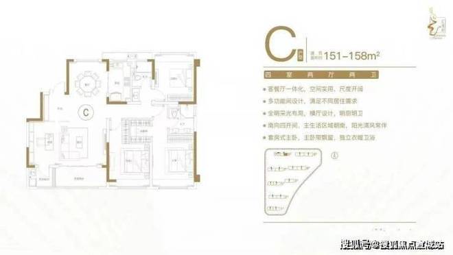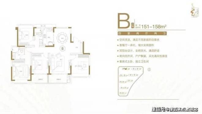 建面约151-158㎡四室两厅两卫户型特点:空间灵活,满足不同家庭阶段需求;客餐厅一体化,增大实用面积;双阳台设计,全明采光,通透舒适;南向四开间,户户飘窗,采光通风性俱佳;套房式主卧,独立卫生间。