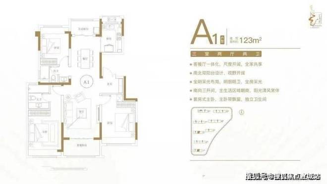 建面约123㎡三室两厅两卫户型特点:客餐厅一体化,尺度开阔,全家共享;南北双阳台设计,视野开阔;全明采光布局,明厨明卫,全房采光;南向三开间,主生活区域朝南,阳光清风常伴;套房式主卧,主卧带飘窗,独立卫生间。