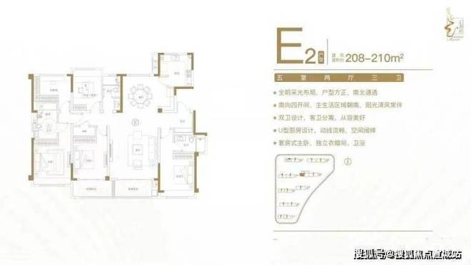 佳运·汇龙府售楼处电话:400-8877-480建面约208-210㎡五室两厅三卫户型特点:全明采光布局,户型方正,南北通透;南向四开间,主生活区域朝南,阳光清风常伴;双卫设计,客卫分离,从容美好;U型厨房设计,动线流畅,空间阔绰;套房式主卧,独立衣帽间、卫浴。