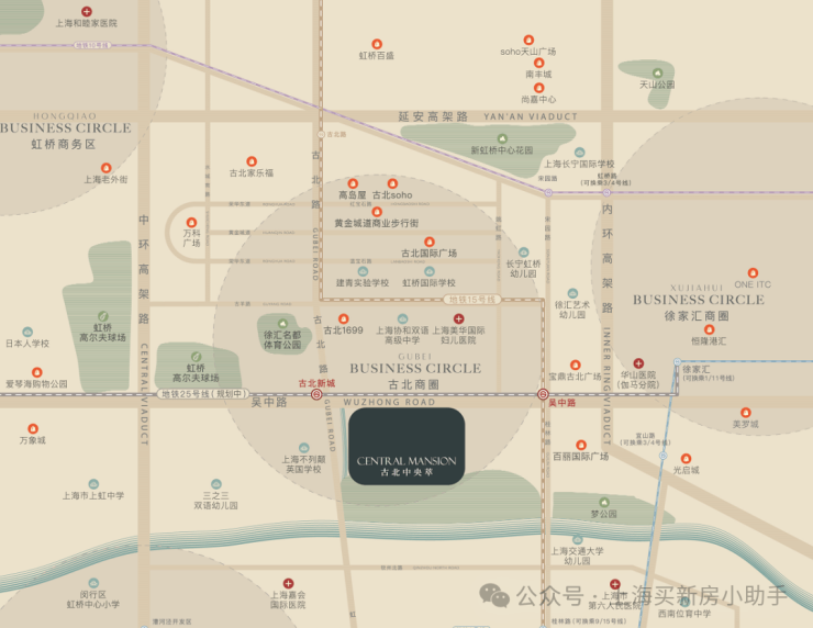 轨交方面:「古北中央萃」是准双轨交的地铁房,现有的是直线距离约700米的最美地铁站之一的15号线吴中路站,未来还会有25号线的古北新城站,站点位置就设在「古北中央萃」西侧不远处。