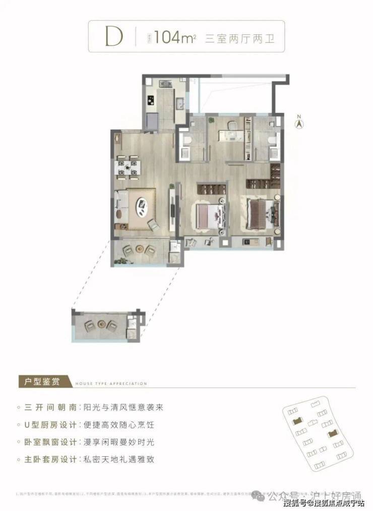 3)建面约104㎡3房2厅2卫,中间套D户型