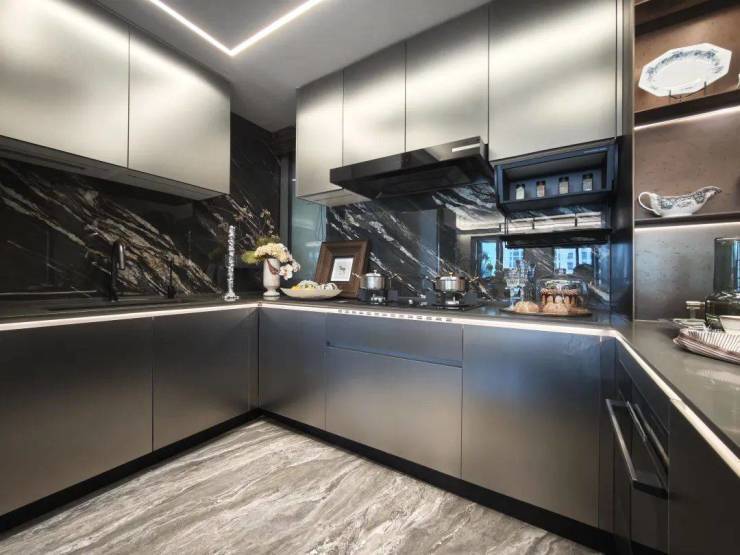 厨房采用U型动线,操作空间比较足,石英石的台面,柜体用了比较时尚的金属色泽材料,整体更具通透性和科技感。厨房北向利用赠送飘窗设置约650深度的加宽台面,定制了古驰黑岩板!