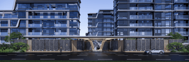 小区归家大门约100米的超级界面,选用45米的宽奢石铺装门头串联起流转水景,蓝翡翠镜面奢石,搭配范思哲黑定制水景,更显尊崇。