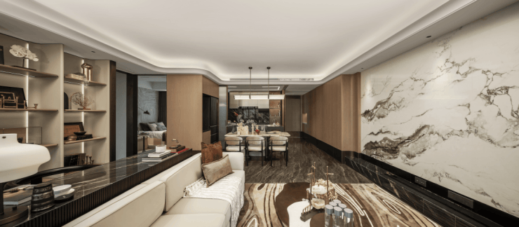 整体的外立面是流线型新海派风格,汲取游艇设计灵感,大面积玻璃外装+更高的窗墙比,运用银灰、深灰作为主色调,局部点缀香槟色线条,创造杨浦顶级住宅的标杆审美。