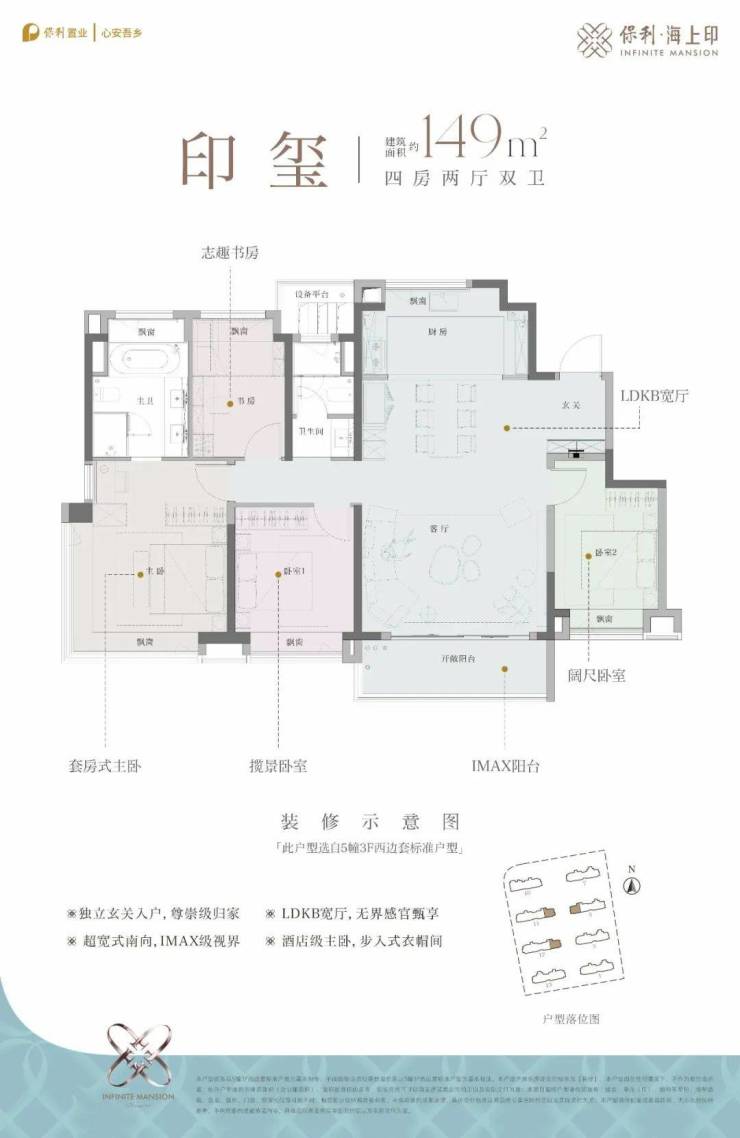 「保利·海上印」꧁ 售楼处电话:400-8855-420【☎☎售楼处电话已认证】꧂⭐✿✿✿✿建面约149㎡4房2厅2卫,该户型也可以说是128户型的进阶版本,各个空间会稍微大一些,客厅面宽约5米,厨房同样附赠飘窗,边套户型主卧为270转角飘窗。