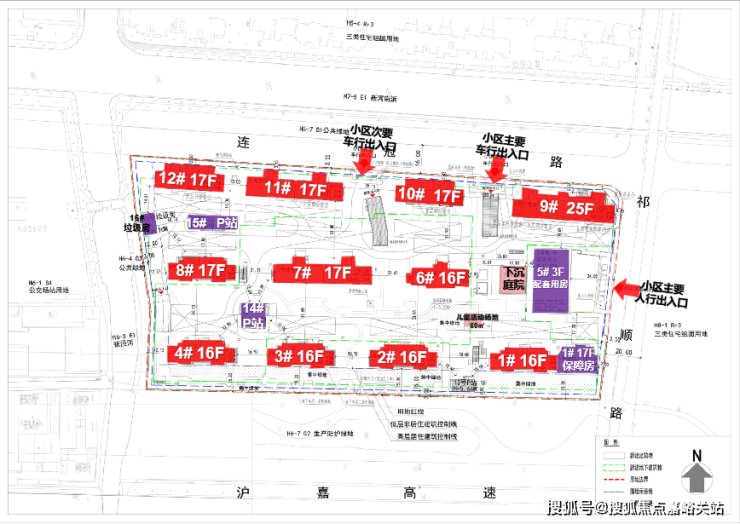 其中1号楼靠近17层的保障房,5号口为3层的配套用房;14#、15#为P站,16#为垃圾用房。