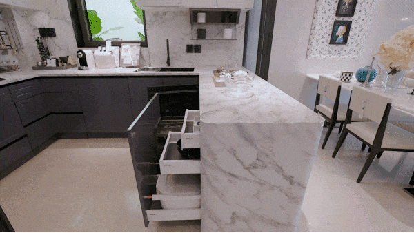 主人在 U型高效厨房忙碌,转身就能加入客厅的谈天说地,灶台的烟火气,瞬间化作亲情的暖流。环幕视野的阳台,是清晨咖啡的观景台,也是孩子眺望星空的瞭望塔。烹饪、会客、观景、亲子…生活场景在此自由切换,无缝交融。