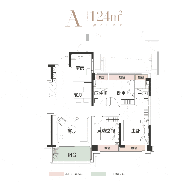 建面约124㎡三房两厅两卫,主卧与次卧共享阔尺人生。