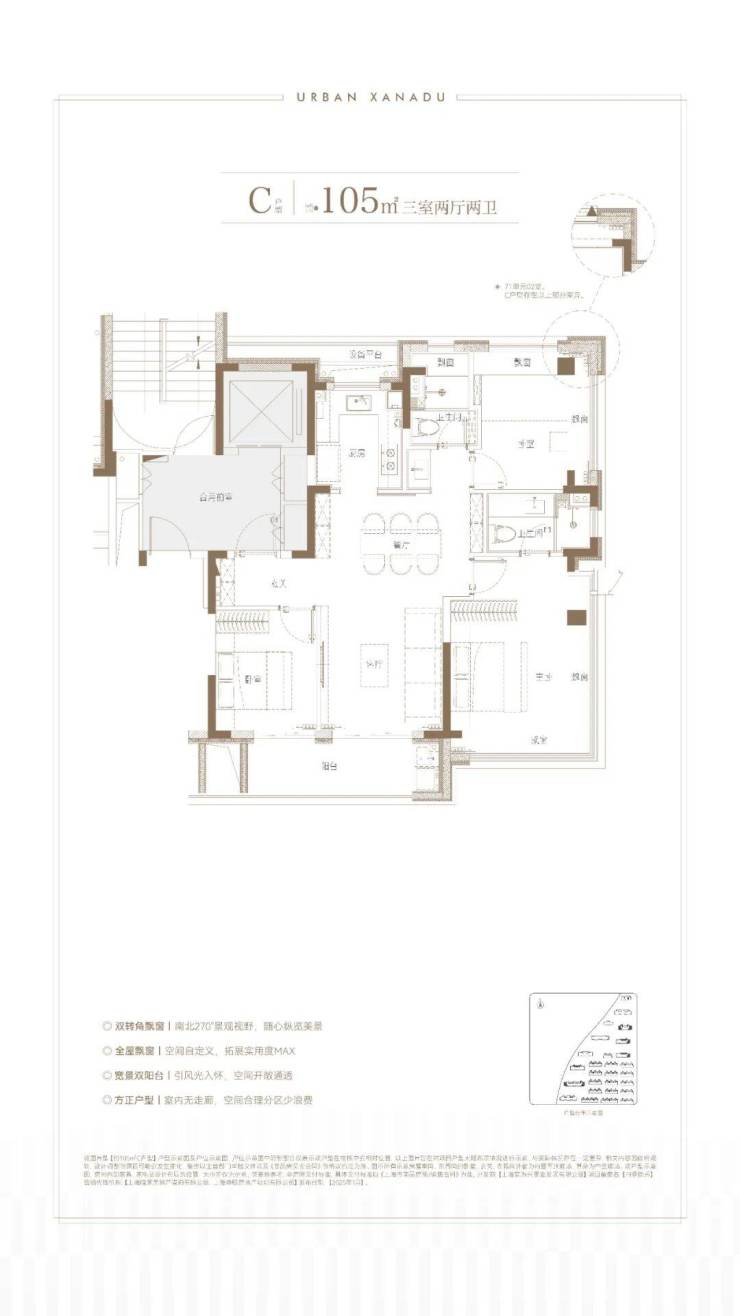整体约10㎡附赠面积,综合得房率约85%。另外,项目还有建面约105㎡3房2卫明星户型,设计更为亮眼。