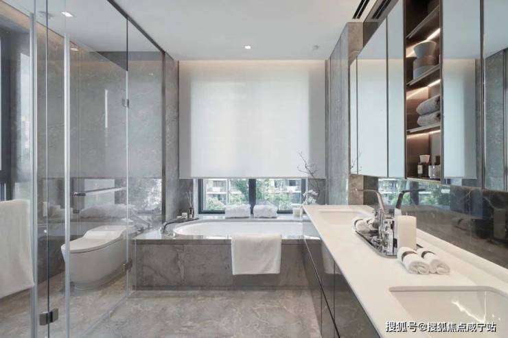 卫生间内整面玻璃镜面都经过特殊处理工艺,有防雾功能,还专为业主提供了全球五星级酒店合作的德国艾利秀电热毛巾架品牌,足不出户就可以体验五星级酒店的高端品质,主卧的双台盆设计,配合当代的龙头、劳芬的洁具,更加彰显大平层业主的豪宅身份!