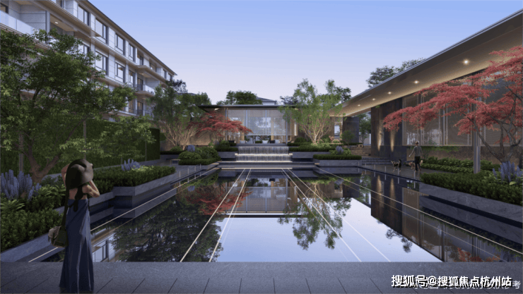 中央水景联动地面景观及地下会所空间,通过三层叠水形成了特色鲜明的水景庭院,引领未来社区发展新趋势。