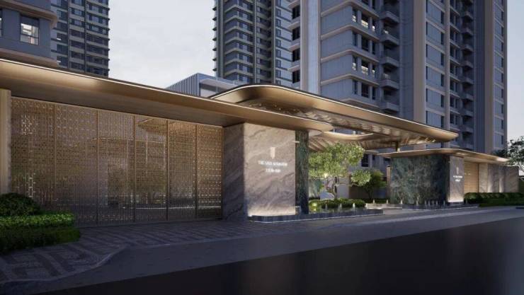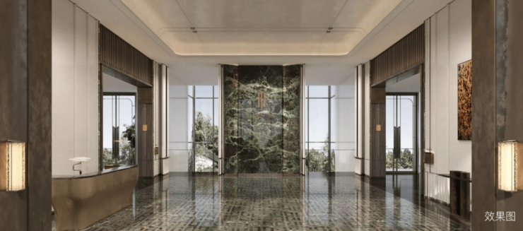 深研三段式的立面设计,顶部香槟色及香槟色格栅,标准层中灰色饰面,横向线条装饰,入户大堂顶部香槟色铝板星空顶满载仪式感,勾勒精致奢华建筑表情,致敬经典,境呈雅致。