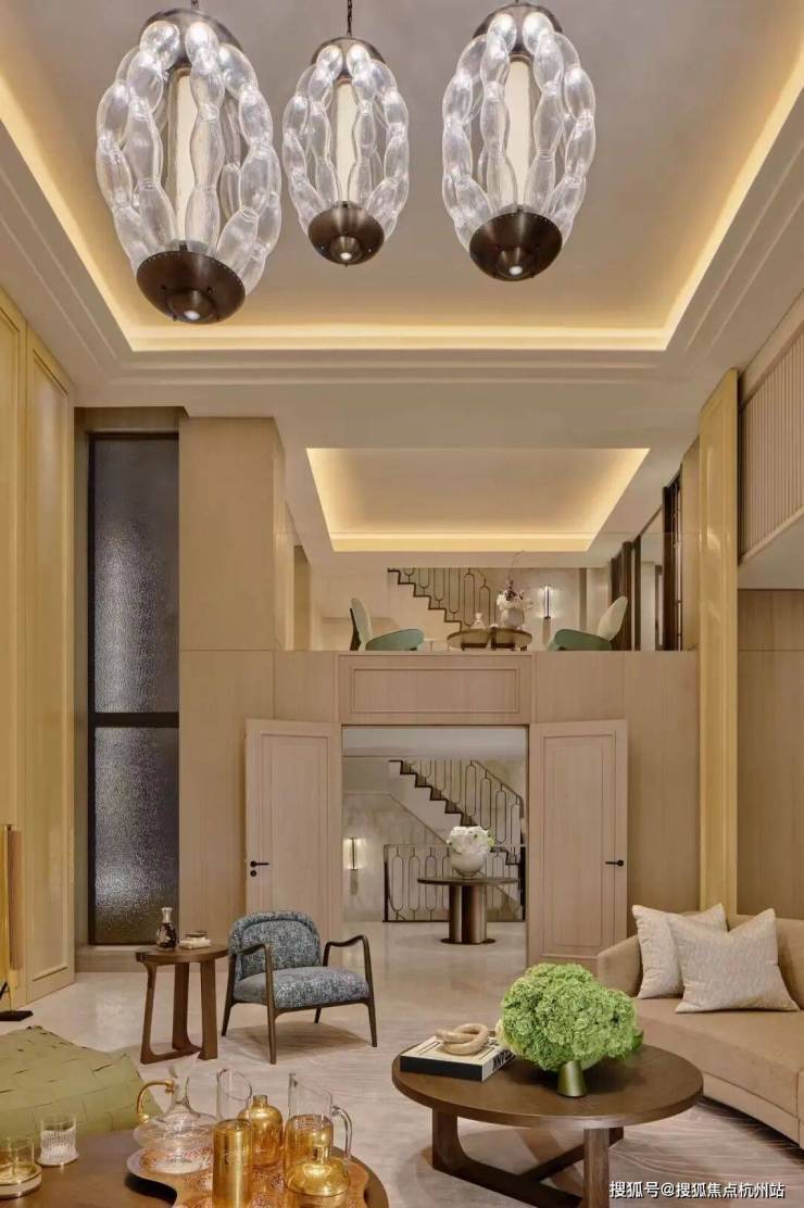 顶层下午茶区以淡绿为底,壁炉暖光漫过手绘地毯的肌理,将社交场域沉淀为冥想容器;主人房墙面缟玛瑙(Onyx)的天然流痕,也与一层屏风暗纹形成时空对位,光影在矿物晶体中生长出私密的诗。