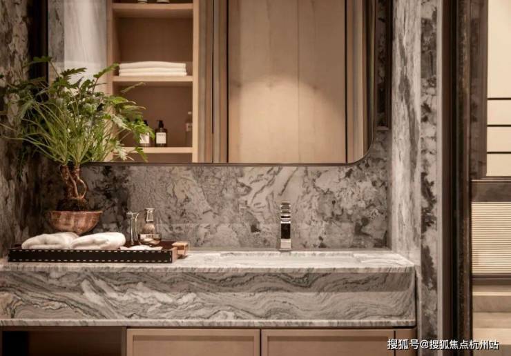 更耐用的细节:比如在主卧背景墙上使用了胡桃木和带有贝母光泽的装饰,在淋浴房用了水云纱石材,这些细节都在默默提升着日常生活的质感。