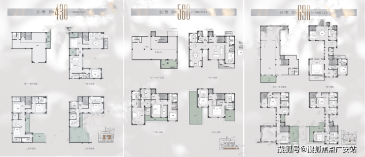项目别墅是大头,且都是拼接型别墅:地上三层,地下一层,联排面积段为430㎡、530㎡、560㎡、700㎡,合计有23套。