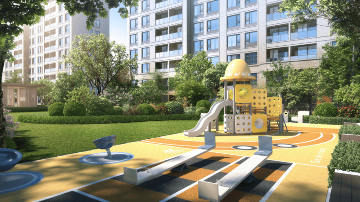 2、约6000㎡超大中心花园,包含阳光草坪、景观会客厅、儿童活动区、成人健身区等环绕布置,尽享绿意生活,构筑三代人的幸福时光。