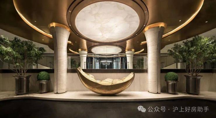 奉贤御湖境以“馆藏”为概念,重写顶级豪宅会所的表达规则。长约54米、高约8米的「殿堂级门扉」,两侧铺陈“奢石之王”蓝翡翠,磅礴气场扑面而来。举首仰望,约300㎡璀璨星空顶模拟出浩瀚银河的深邃意境。正面是由1286块浅米色瓷筒融合在地非遗“锔瓷”技艺打造的艺术瓷墙。