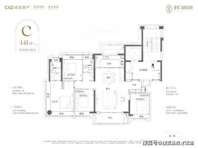 户型特色:96㎡三房两厅两卫户型,三开间朝南,LDKB 一体化设计,全景飘窗,空间通透;141㎡四房两厅两卫户型,四叶草布局,约 7.2 米宽厅连接 270° 转角阳台,主卧套房含独立衣帽间及双台盆卫浴,私密性与功能性兼备。