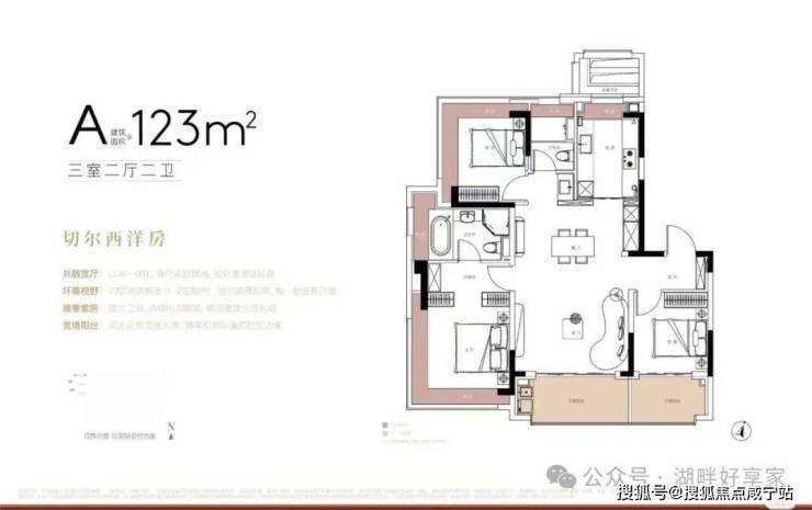 洋房:建面约123㎡小高层三房飞机户型+洋房设计,搭配双阳台+多飘窗(边套含双270°转角飘窗),层高约3.15米;客厅设计更具选择:竖厅面宽约4.5米,宽敞通透;横厅面宽达约6.1米,多出灵动空间可作开放式书房、茶室,适配多元生活场景。总价753万起。