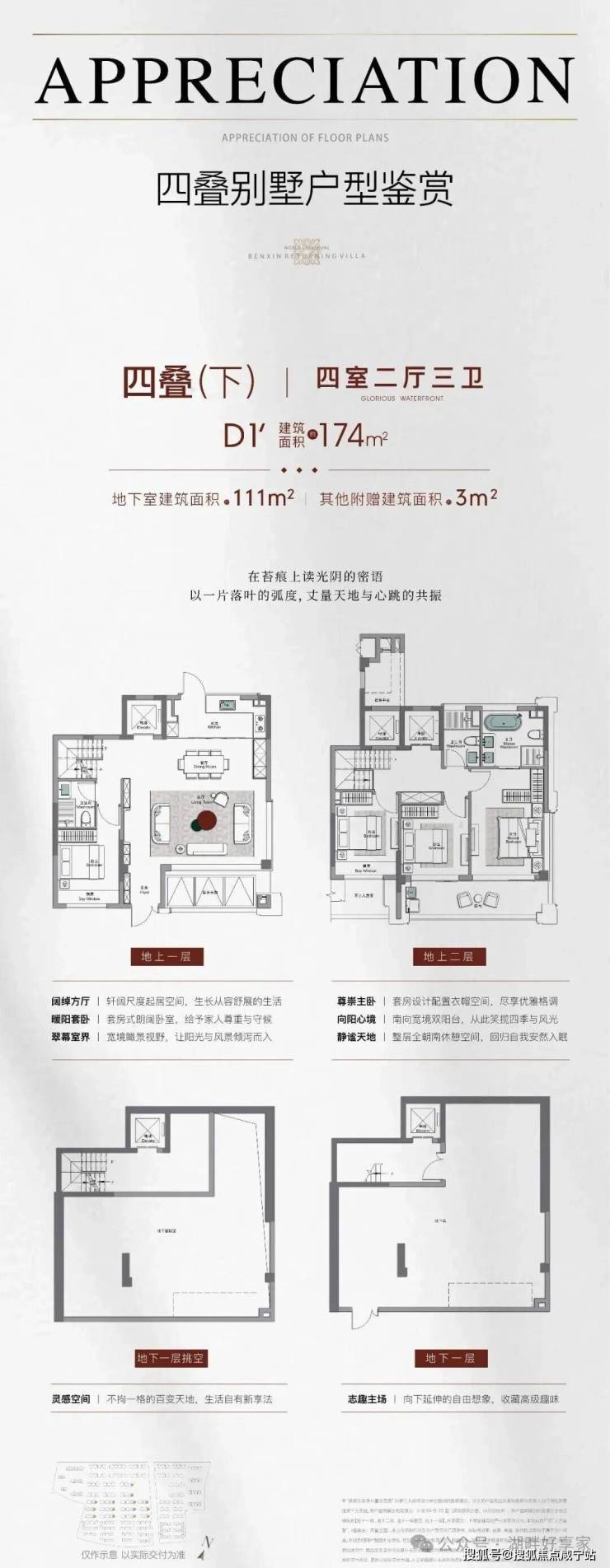 合院:建面约190㎡三室两厅三卫、约210-230㎡四室两厅三卫/四卫,附赠地下室+露台,总价预计约2000万;3层地上+地下室设计。