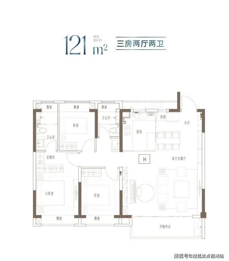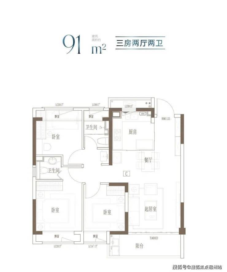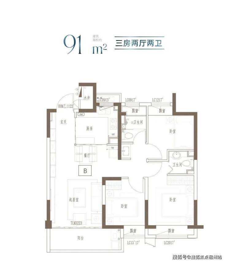 建面约91m²的这个户型,3开间朝南,全屋阳光充足;L型厨房转角移门设计,最大化空间视野;四飘窗设计,通透空间享受;动静分区,亲密有度;套房式主卧,容纳私谧生活点滴。