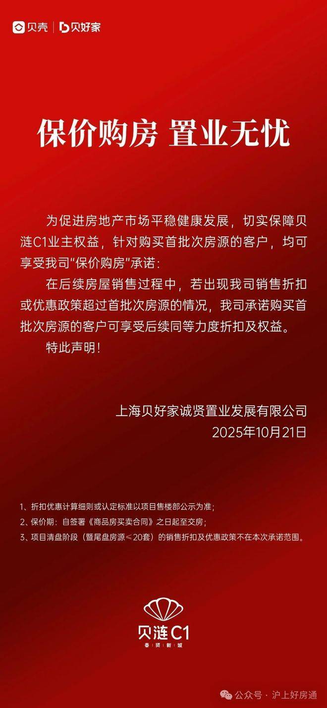 10月21日, 贝壳旗下贝好家在上海的首个项目“贝涟C1”发布公告,推出“保价购房”承诺 :凡购买首批房源的客户,若后期出现更大力度的销售折扣或优惠,可同步享受同等级别的权益补差。