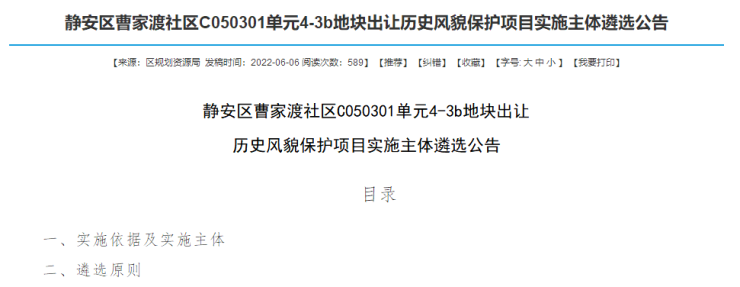 2022年6月,静安区人民政府官宣了曹家渡社区C050301单元4-3b地块的出让公告。