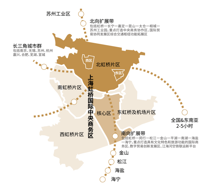 上虹桥依托东西两个片区(西居东产,共计约167公顷),遵循“以人为本、产城融合、多元包容、活力共享”的理念,整体打造创新经济集聚区、中央商务配套区和高品质国际化社区。